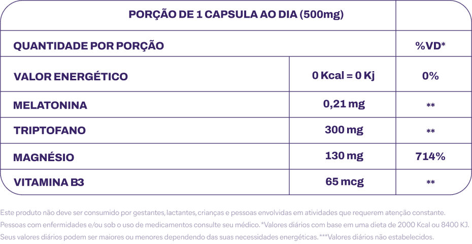 Ingira uma capsula 60 minutos antes de dormir e sinta os efeitos da suplementação natural logo na primeira noite de sono, regulando e otimizando o seu descanso